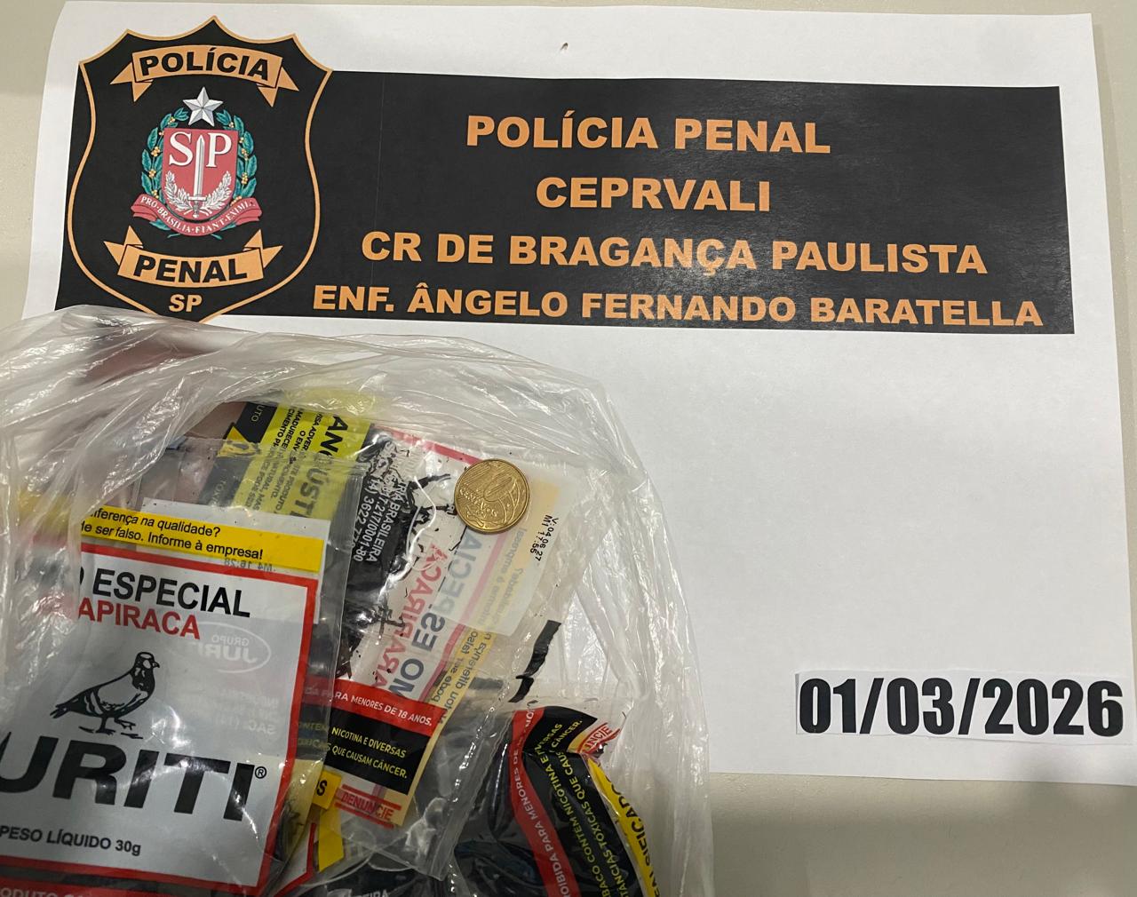 Ainda no mesmo dia, o Centro de Ressocialização de Bragança Paulista registrou uma apreensão durante a revista em itens trazidos por familiares dos custodiados. Enquanto inspecionava os objetos de uma mulher de 48 anos, mãe de um sentenciado, um Policial Penal encontrou uma moeda de R$ 0,10 no fundo de um saco transparente, e também três pacotes de fumo e um isqueiro. Ela relatou que havia esquecido os itens dentro da bolsa. A mulher foi advertida pelo servidor de que não é permitido a entrada de dinheiro nos estabelecimentos prisionais, e que a conduta causa a suspensão da visita por 90 dias, conforme estabelecido pela Resolução 144/2010 da SAP.