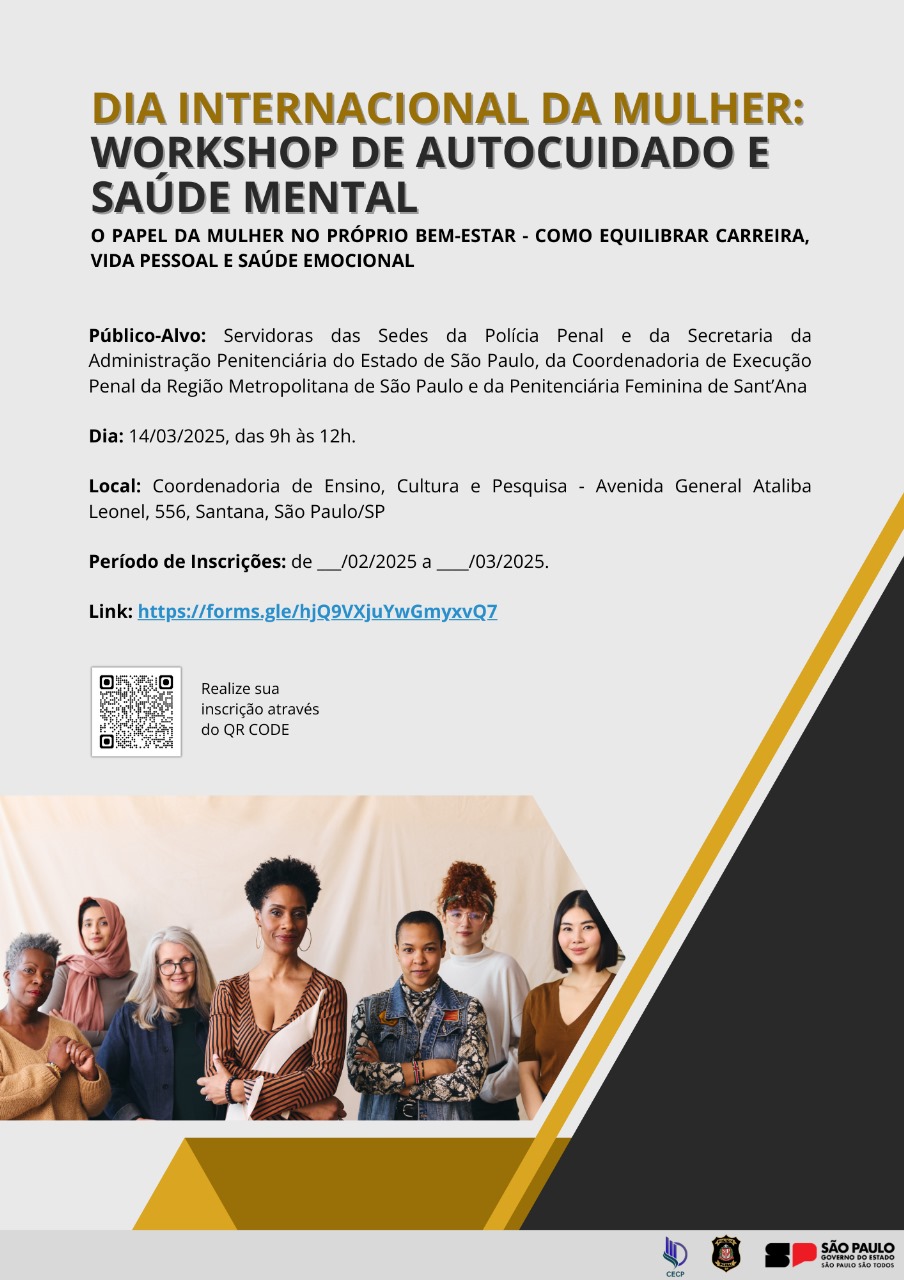 Na próxima sexta-feira (14), das 9h às 12h, a Coordenadoria de Ensino, Cultura e Pesquisa promove o Workshop de Autocuidado e Saúde Mental: "O Papel da Mulher no Próprio Bem-Estar - Como Equilibrar Carreira, Vida Pessoal e Saúde Emocional".
