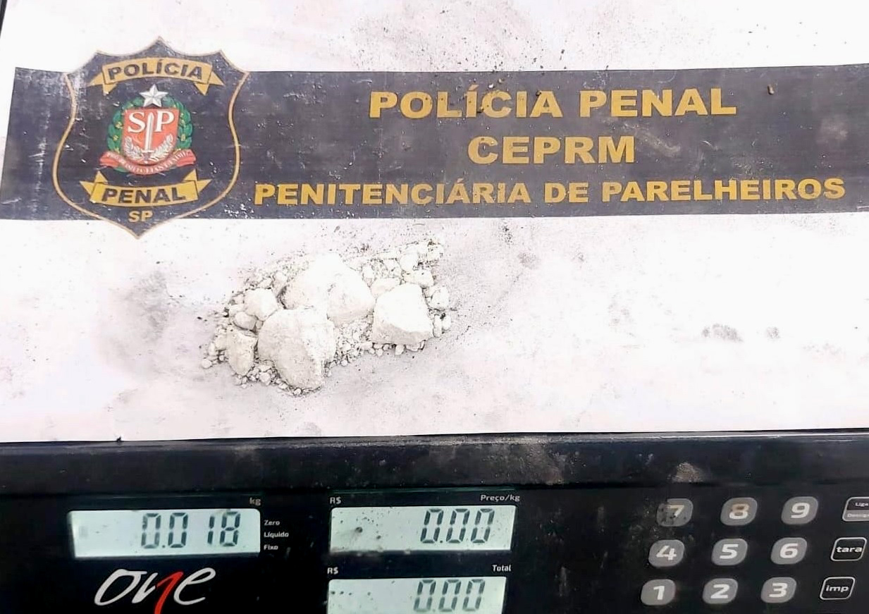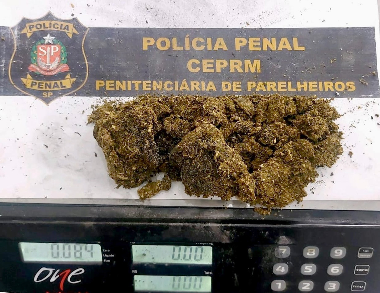 Os Policiais Penais verificaram que no interior da embalagem havia 84 gramas de substância análoga à maconha e 18 gramas de substância branca, semelhante à cocaína.