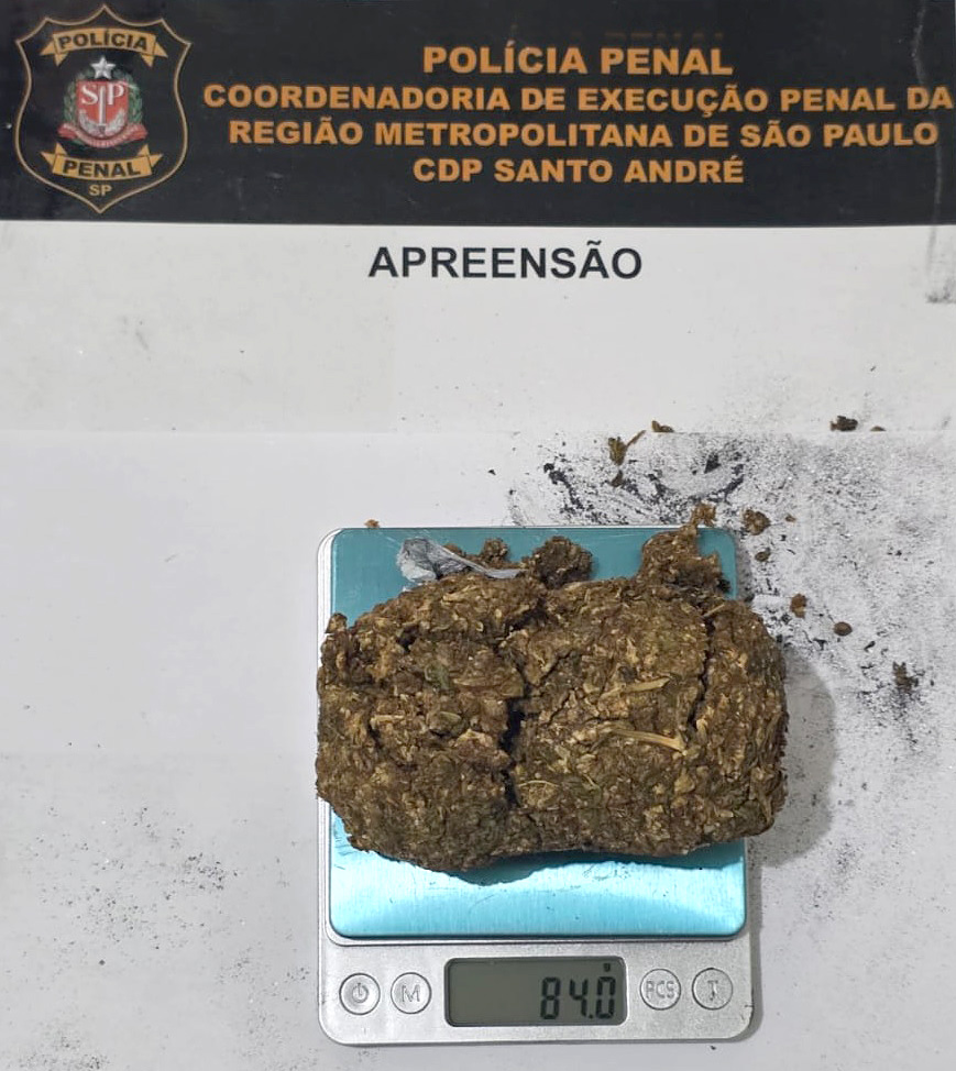 Em sala reservada, a companheira do preso realizou a retirada espontânea do invólucro, sendo constatado, após abertura, tratar-se de substância esverdeada, com características análogas à maconha, totalizando 84 gramas.